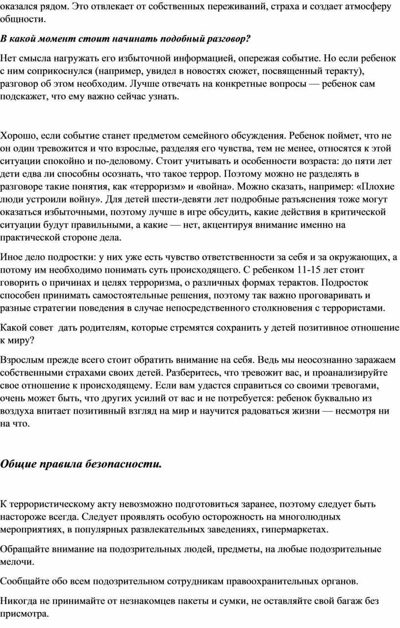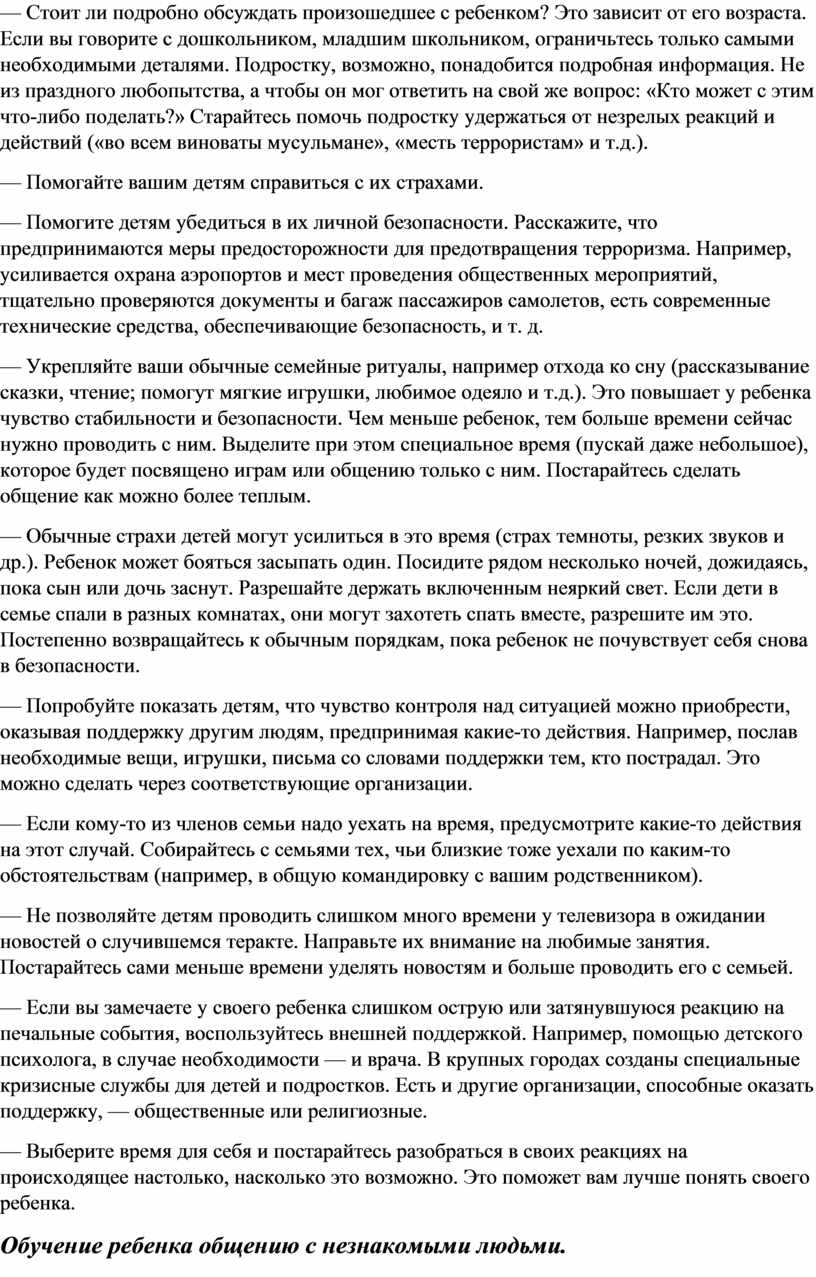 — Помогите детям убедиться в их личной безопасности. Расскажите, что предпринимаются меры предосторожности для предотвращения терроризма. Например, усиливается охрана аэропортов и мест проведения общественных мероприятий, тщательно проверяются документы и багаж пассажиров самолетов, есть современные технические средства, обеспечивающие безопасность, и т. д.