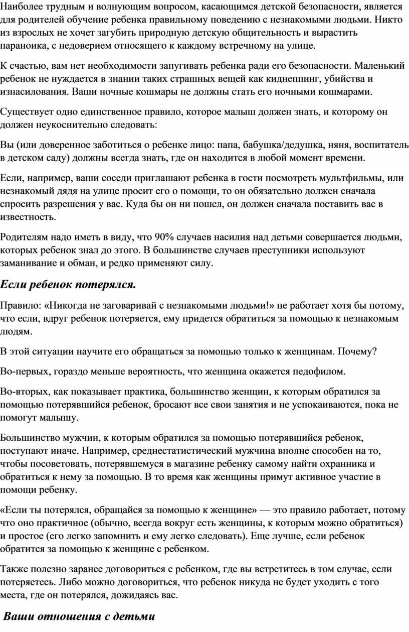 Правило: «Никогда не заговаривай с незнакомыми людьми!» не работает хотя бы потому, что если, вдруг ребенок потеряется, ему придется обратиться за помощью к незнакомым людям.