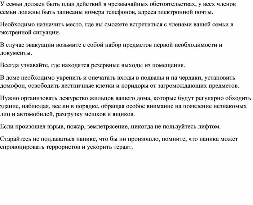У семьи должен быть план действий в чрезвычайных обстоятельствах, у всех членов семьи должны быть записаны номера телефонов, адреса электронной почты.