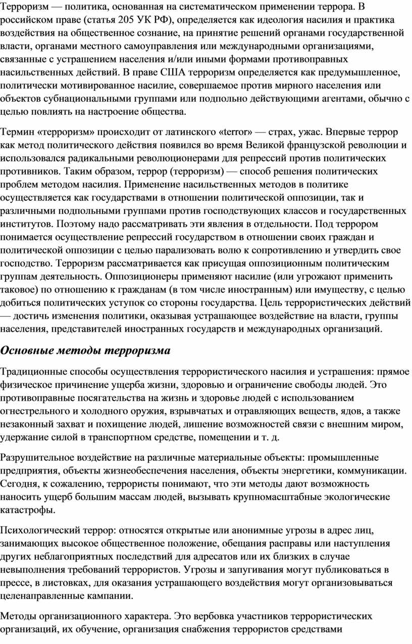 Терроризм — политика, основанная на систематическом применении террора. В российском праве (статья 205 УК РФ), определяется как идеология насилия и практика воздействия на общественное сознание, на принятие решений органами государственной власти, органами местного самоуправления или международными организациями, связанные с устрашением населения и/или иными формами противоправных насильственных действий. В праве США терроризм определяется как предумышленное, политически мотивированное насилие, совершаемое против мирного населения или объектов субнациональными группами или подпольно действующими агентами, обычно с целью повлиять на настроение общества.