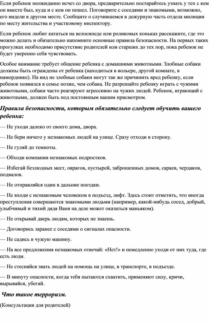 Если ребенок неожиданно исчез со двора, предварительно постарайтесь узнать у тех с кем он вместе был, куда и с кем он пошел. Поговорите с соседями и знакомыми, возможно, его видели в другом месте. Сообщите о случившемся в дежурную часть отдела милиции по месту жительства и участковому инспектору.