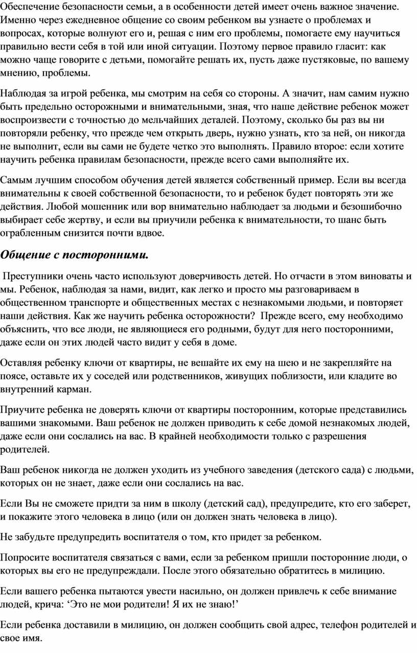 Обеспечение безопасности семьи, а в особенности детей имеет очень важное значение. Именно через ежедневное общение со своим ребенком вы узнаете о проблемах и вопросах, которые волнуют его и, решая с ним его проблемы, помогаете ему научиться правильно вести себя в той или иной ситуации. Поэтому первое правило гласит: как можно чаще говорите с детьми, помогайте решать их, пусть даже пустяковые, по вашему мнению, проблемы.