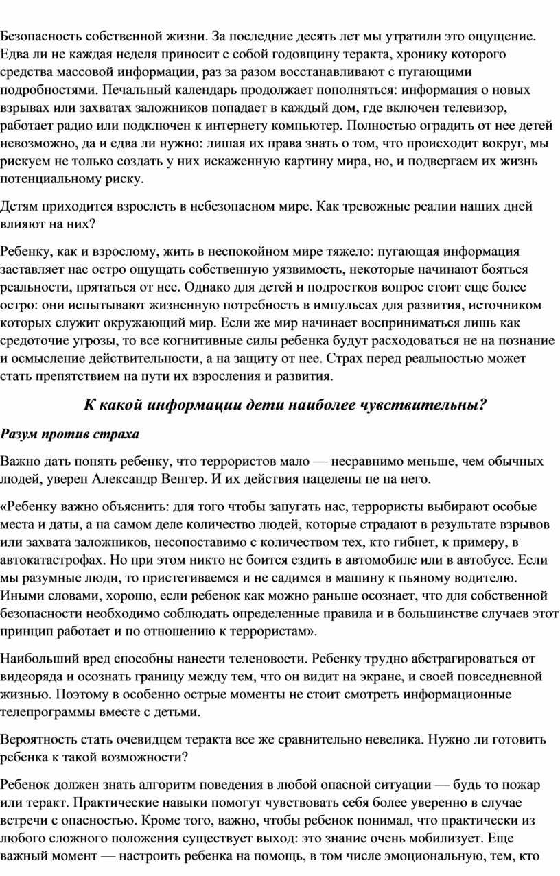 Безопасность собственной жизни. За последние десять лет мы утратили это ощущение. Едва ли не каждая неделя приносит с собой годовщину теракта, хронику которого средства массовой информации, раз за разом восстанавливают с пугающими подробностями. Печальный календарь продолжает пополняться: информация о новых взрывах или захватах заложников попадает в каждый дом, где включен телевизор, работает радио или подключен к интернету компьютер. Полностью оградить от нее детей невозможно, да и едва ли нужно: лишая их права знать о том, что происходит вокруг, мы рискуем не только создать у них искаженную картину мира, но, и подвергаем их жизнь потенциальному риску.