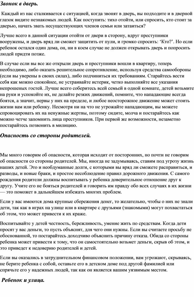 Гуляя с ребенком, старайтесь не делать ему немотивированных замечаний, которые могут вызвать протест ребенка и желание досадить вам. Выходя из квартиры, ваш ребенок должен посмотреть в глазок и, если на площадке неизвестные лица, дождаться их ухода или попросить вас проводить его на улицу. Запирайте дверь на все замки, не удовлетворяйтесь захлопнутой дверью. Уберите ключи в потайной кармашек.