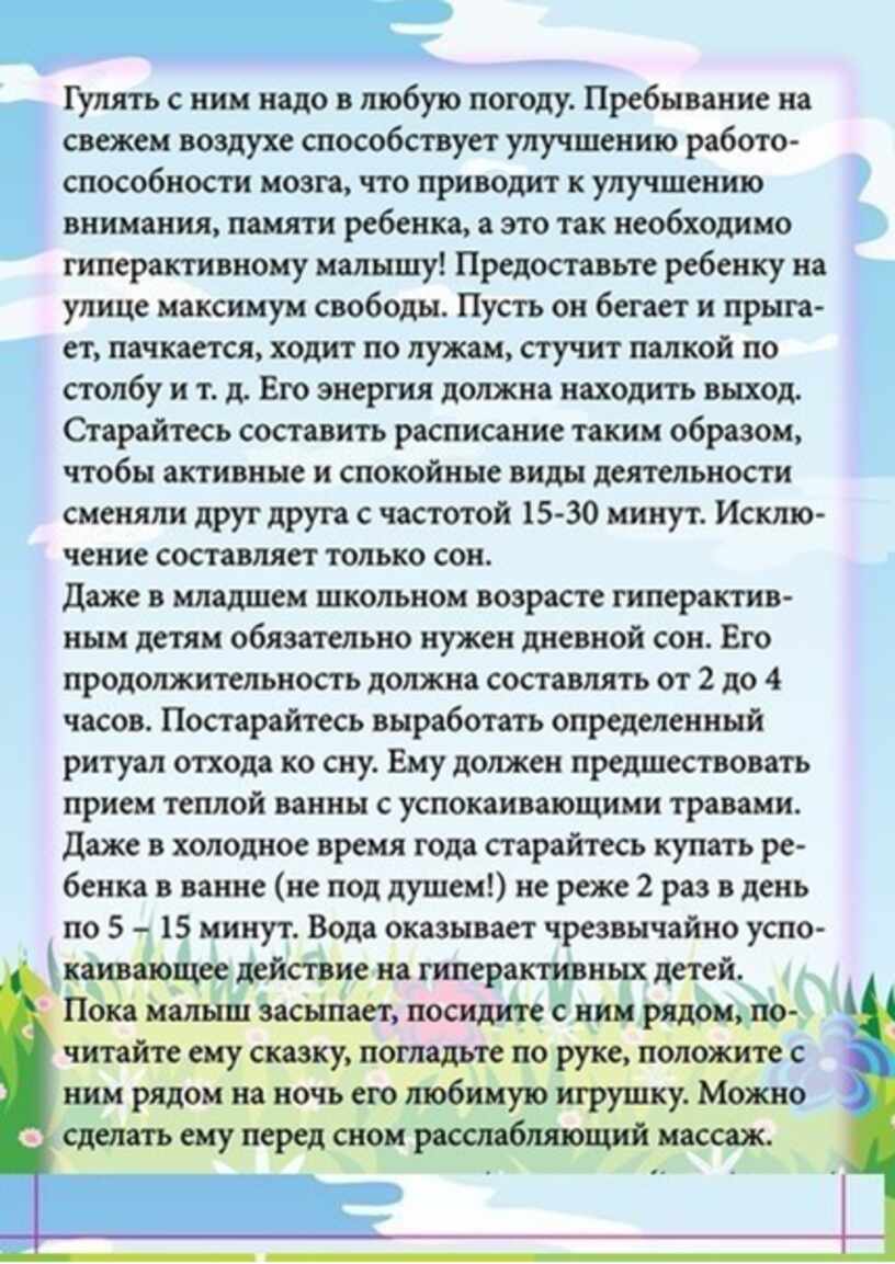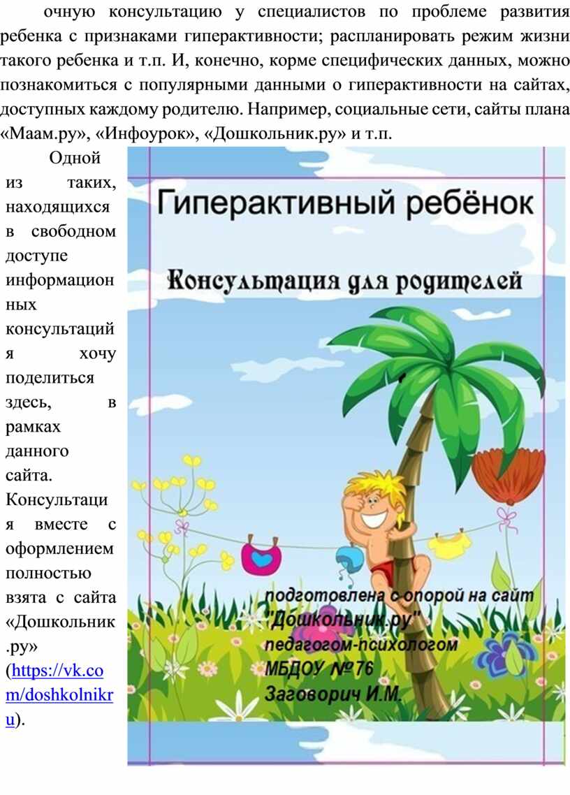 В современном мире достаточное количество источников информации, позволяющих получить полноценное представление о данной особенности развития ребенка, а так же о перспективах дальнейшей жизни гиперактивного ребенка; получить онлайн или очную консультацию у специалистов по проблеме развития ребенка с признаками гиперактивности; распланировать режим жизни такого ребенка и т.п. И, конечно, корме специфических данных, можно познакомиться с популярными данными о гиперактивности на сайтах, доступных каждому родителю. Например, социальные сети, сайты плана «Маам.ру», «Инфоурок», «Дошкольник.ру» и т.п.