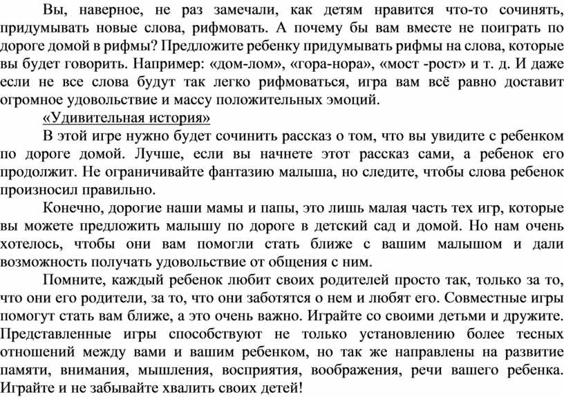 Конечно, дорогие наши мамы и папы, это лишь малая часть тех игр, которые вы можете предложить малышу по дороге в детский сад и домой. Но нам очень хотелось, чтобы они вам помогли стать ближе с вашим малышом и дали возможность получать удовольствие от общения с ним.