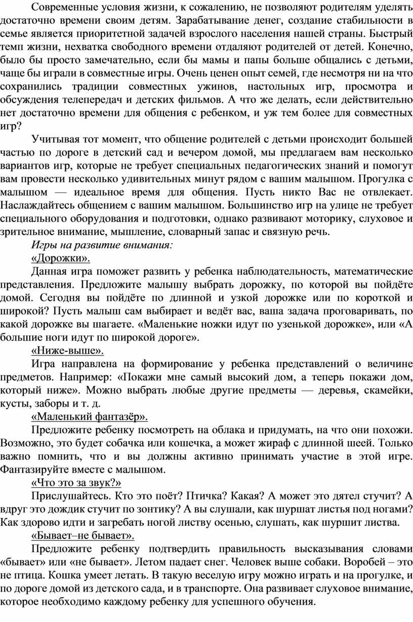 Учитывая тот момент, что общение родителей с детьми происходит большей частью по дороге в детский сад и вечером домой, мы предлагаем вам несколько вариантов игр, которые не требует специальных педагогических знаний и помогут вам провести несколько удивительных минут рядом с вашим малышом. Прогулка с малышом — идеальное время для общения. Пусть никто Вас не отвлекает. Наслаждайтесь общением с вашим малышом. Большинство игр на улице не требует специального оборудования и подготовки, однако развивают моторику, слуховое и зрительное внимание, мышление, словарный запас и связную речь.