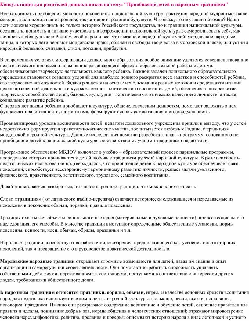 Консультация для родителей дошкольников на тему: "Приобщение детей к народным традициям"