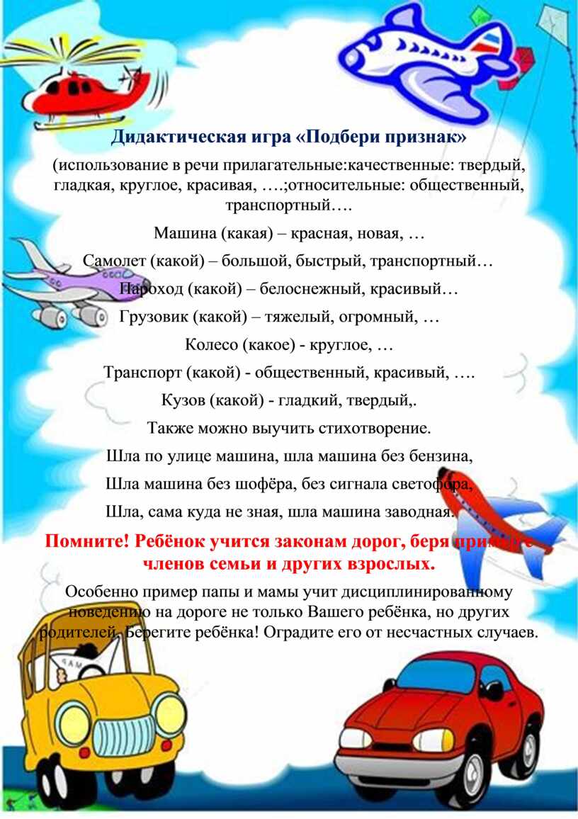 Самолет (какой) – большой, быстрый, транспортный… Пароход (какой) – белоснежный, красивый… Грузовик (какой) – тяжелый, огромный, …