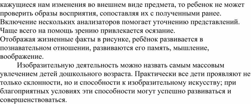 Для изобразительной деятельности в первую очередь важно развитие зрения и осязания. При помощи зрения мы воспринимаем многие качества предмета: форму, размеры, цвет, положение в пространстве. Если взрослый человек на основании прежнего опыта может более или менее правильно понять кажущиеся нам изменения во внешнем виде предмета, то ребенок не может проверить образы восприятия, сопоставляя их с полученными ранее.