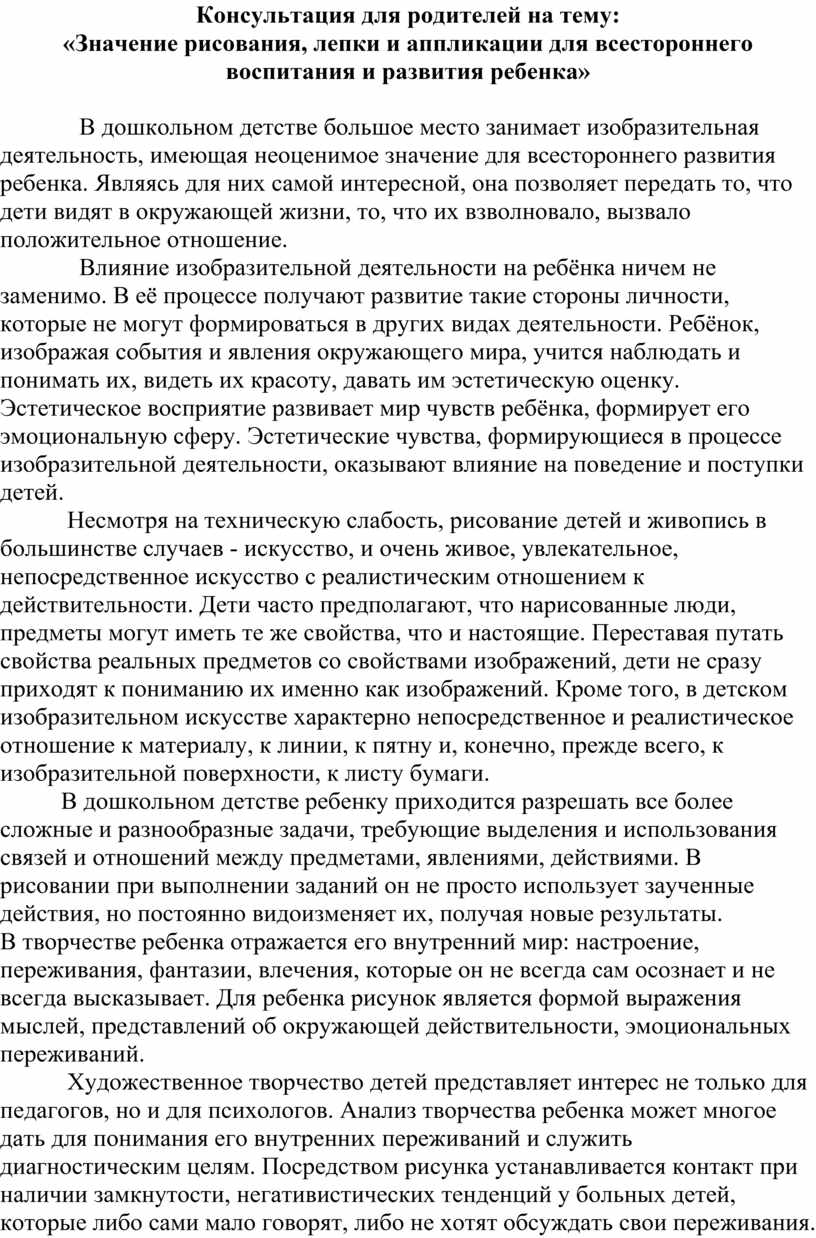 «Значение рисования, лепки и аппликации для всестороннего воспитания и развития ребенка»