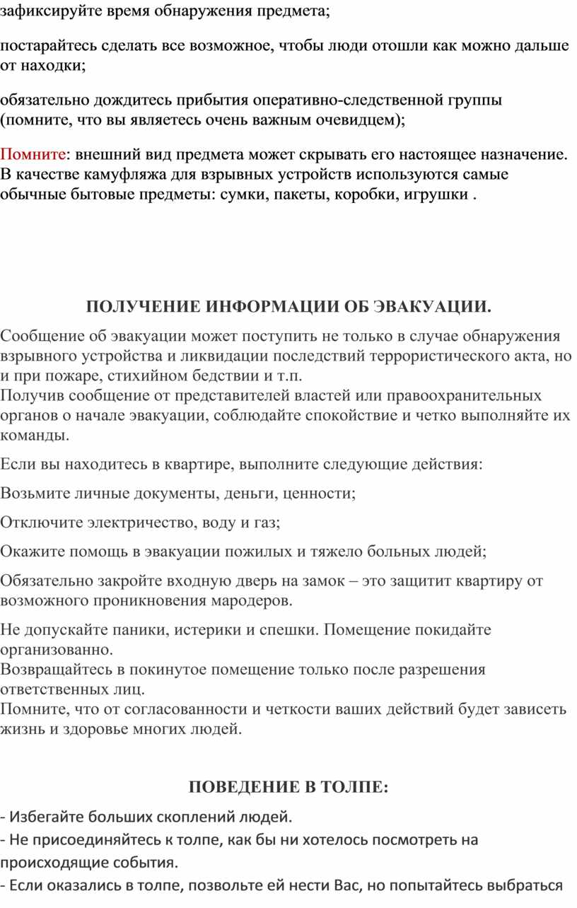 начале эвакуации, соблюдайте спокойствие и четко выполняйте их команды.
