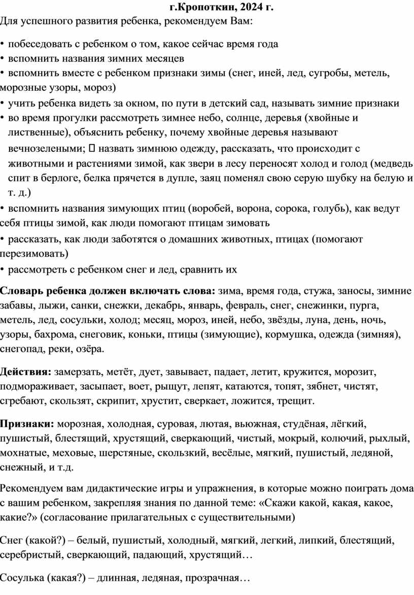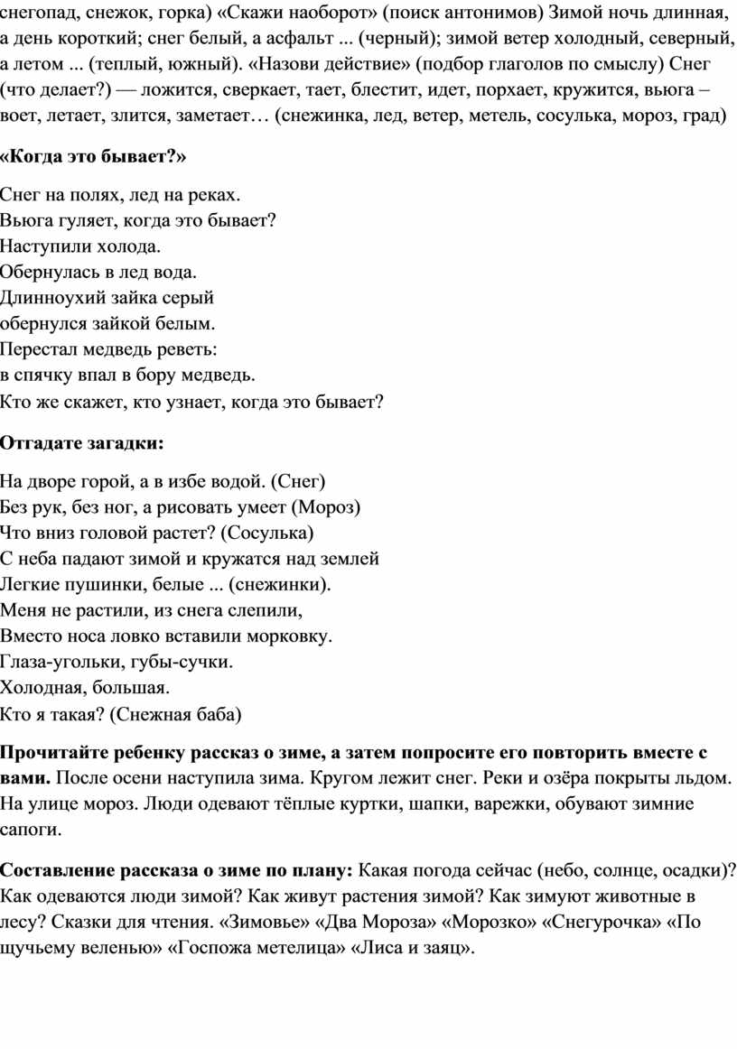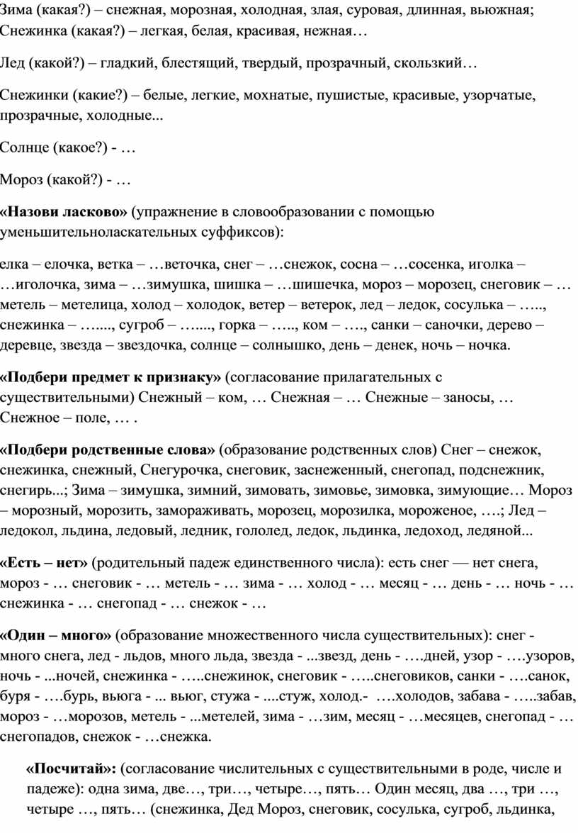 «Посчитай»: (согласование числительных с существительными в роде, числе и падеже): одна зима, две…, три…, четыре…, пять… Один месяц, два …, три …, четыре …, пять… (снежинка, Дед Мороз, снеговик, сосулька, сугроб, льдинка, снегопад, снежок, горка) «Скажи наоборот» (поиск антонимов) Зимой ночь длинная, а день короткий; снег белый, а асфальт ... (черный); зимой ветер холодный, северный, а летом ... (теплый, южный). «Назови действие» (подбор глаголов по смыслу) Снег (что делает?) — ложится, сверкает, тает, блестит, идет, порхает, кружится, вьюга – воет, летает, злится, заметает… (снежинка, лед, ветер, метель, сосулька, мороз, град)