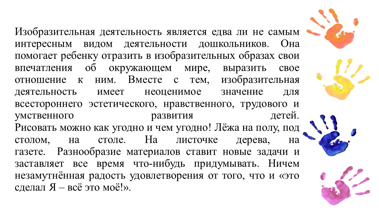Изобразительная деятельность является едва ли не самым интересным видом деятельности дошкольников. Она помогает ребенку отразить в изобразительных образах свои впечатления об окружающем мире, выразить свое отношение к ним. Вместе с тем, изобразительная деятельность имеет неоценимое значение для всестороннего эстетического, нравственного, трудового и умственного развития детей. Рисовать можно как угодно и чем угодно! Лёжа на полу, под столом, на столе. На листочке дерева, на газете. Разнообразие материалов ставит новые задачи и заставляет все время что-нибудь придумывать. Ничем незамутнённая радость удовлетворения от того, что и «это сделал Я – всё это моё!».