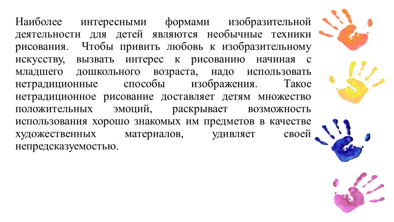 Наиболее интересными формами изобразительной деятельности для детей являются необычные техники рисования. Чтобы привить любовь к изобразительному искусству, вызвать интерес к рисованию начиная с младшего дошкольного возраста, надо использовать нетрадиционные способы изображения. Такое нетрадиционное рисование доставляет детям множество положительных эмоций, раскрывает возможность использования хорошо знакомых им предметов в качестве художественных материалов, удивляет своей непредсказуемостью.