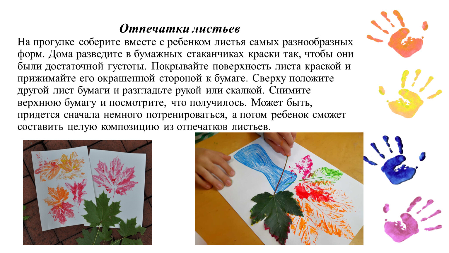 Отпечатки листьевНа прогулке соберите вместе с ребенком листья самых разнообразных форм. Дома разведите в бумажных стаканчиках краски так, чтобы они были достаточной густоты. Покрывайте поверхность листа краской и прижимайте его окрашенной стороной к бумаге. Сверху положите другой лист бумаги и разгладьте рукой или скалкой. Снимите верхнюю бумагу и посмотрите, что получилось. Может быть, придется сначала немного потренироваться, а потом ребенок сможет составить целую композицию из отпечатков листьев.