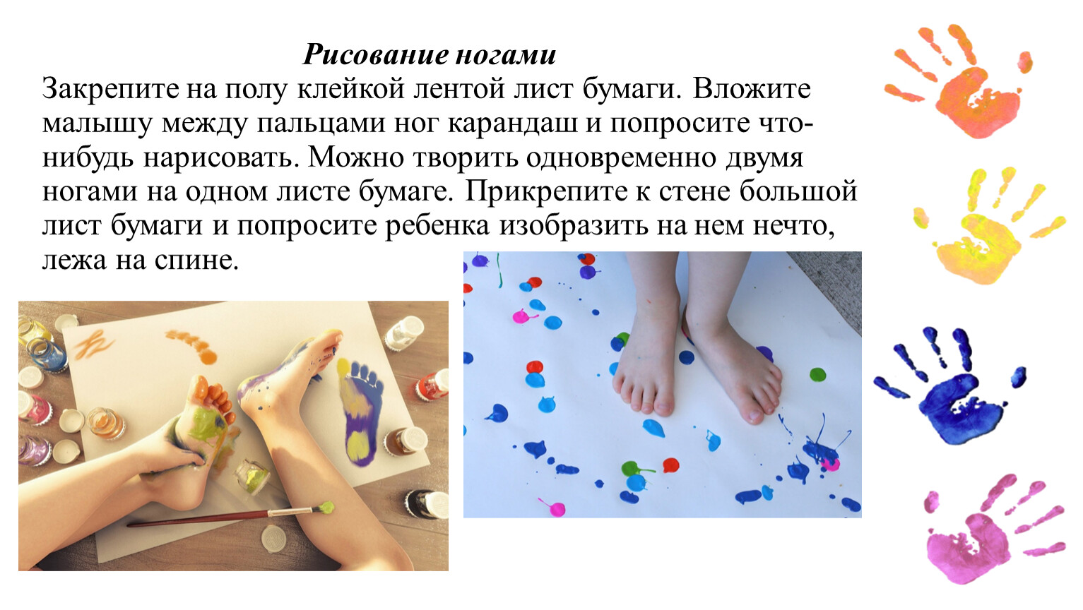 Рисование ногамиЗакрепите на полу клейкой лентой лист бумаги. Вложите малышу между пальцами ног карандаш и попросите что-нибудь нарисовать. Можно творить одновременно двумя ногами на одном листе бумаге. Прикрепите к стене большой лист бумаги и попросите ребенка изобразить на нем нечто, лежа на спине.