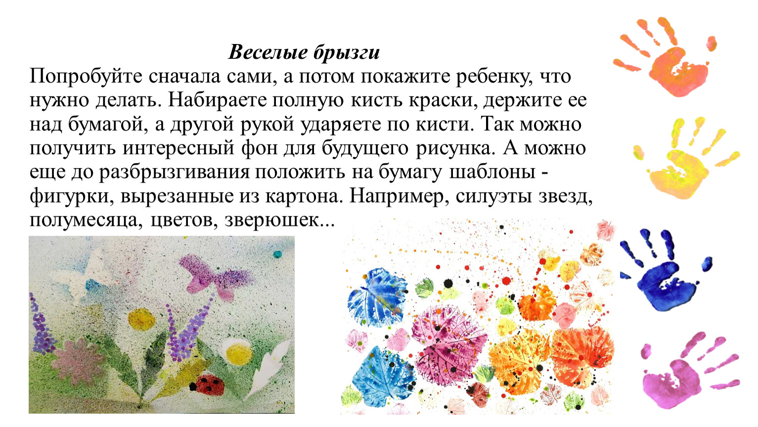 Веселые брызгиПопробуйте сначала сами, а потом покажите ребенку, что нужно делать. Набираете полную кисть краски, держите ее над бумагой, а другой рукой ударяете по кисти. Так можно получить интересный фон для будущего рисунка. А можно еще до разбрызгивания положить на бумагу шаблоны - фигурки, вырезанные из картона. Например, силуэты звезд, полумесяца, цветов, зверюшек...