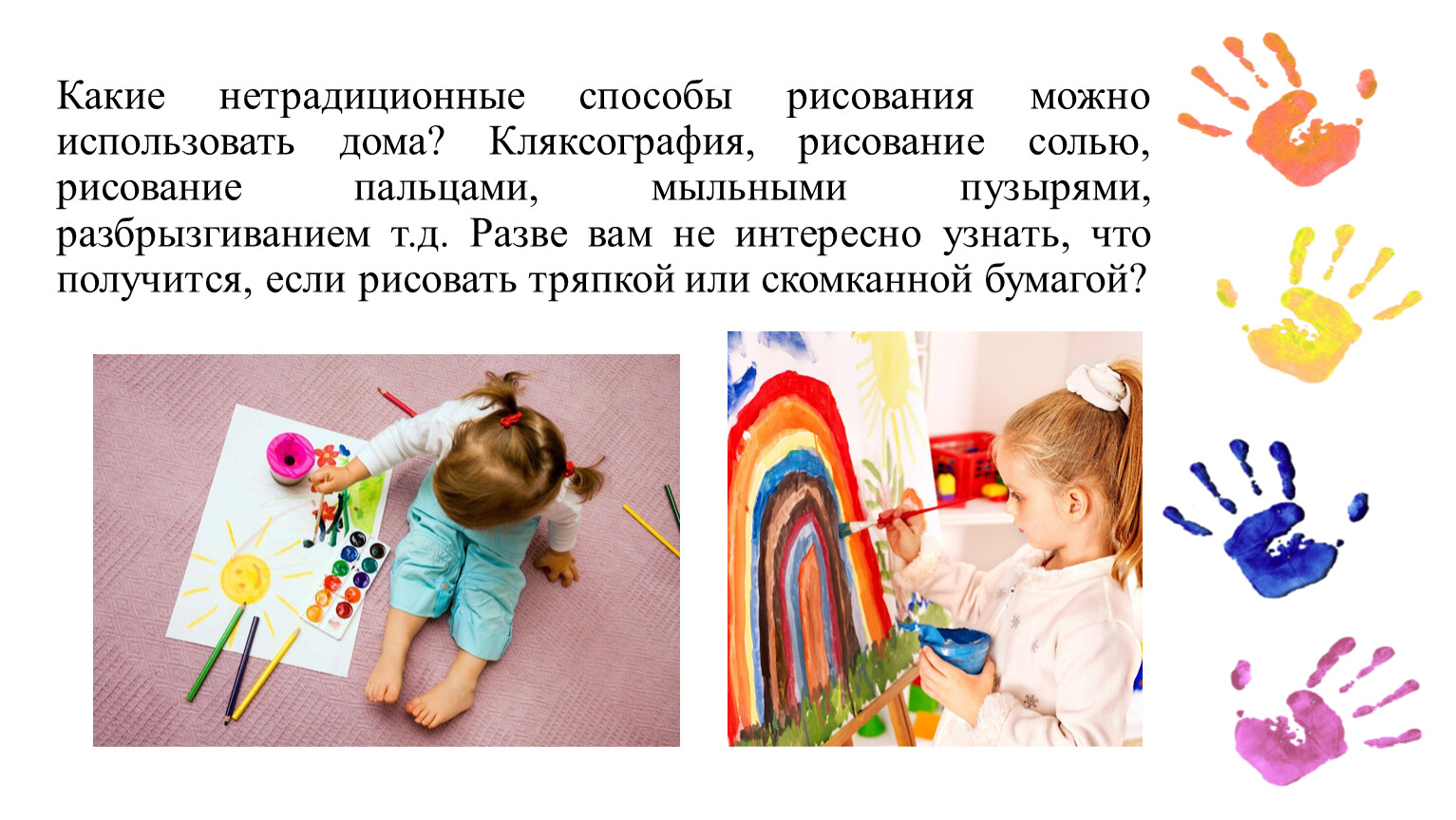 Какие нетрадиционные способы рисования можно использовать дома? Кляксография, рисование солью, рисование пальцами, мыльными пузырями, разбрызгиванием т.д. Разве вам не интересно узнать, что получится, если рисовать тряпкой или скомканной бумагой?