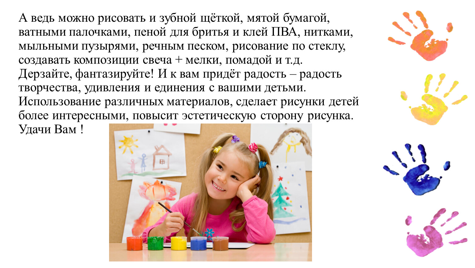 А ведь можно рисовать и зубной щёткой, мятой бумагой, ватными палочками, пеной для бритья и клей ПВА, нитками, мыльными пузырями, речным песком, рисование по стеклу, создавать композиции свеча + мелки, помадой и т.д. Дерзайте, фантазируйте! И к вам придёт радость – радость творчества, удивления и единения с вашими детьми. Использование различных материалов, сделает рисунки детей более интересными, повысит эстетическую сторону рисунка. Удачи Вам !