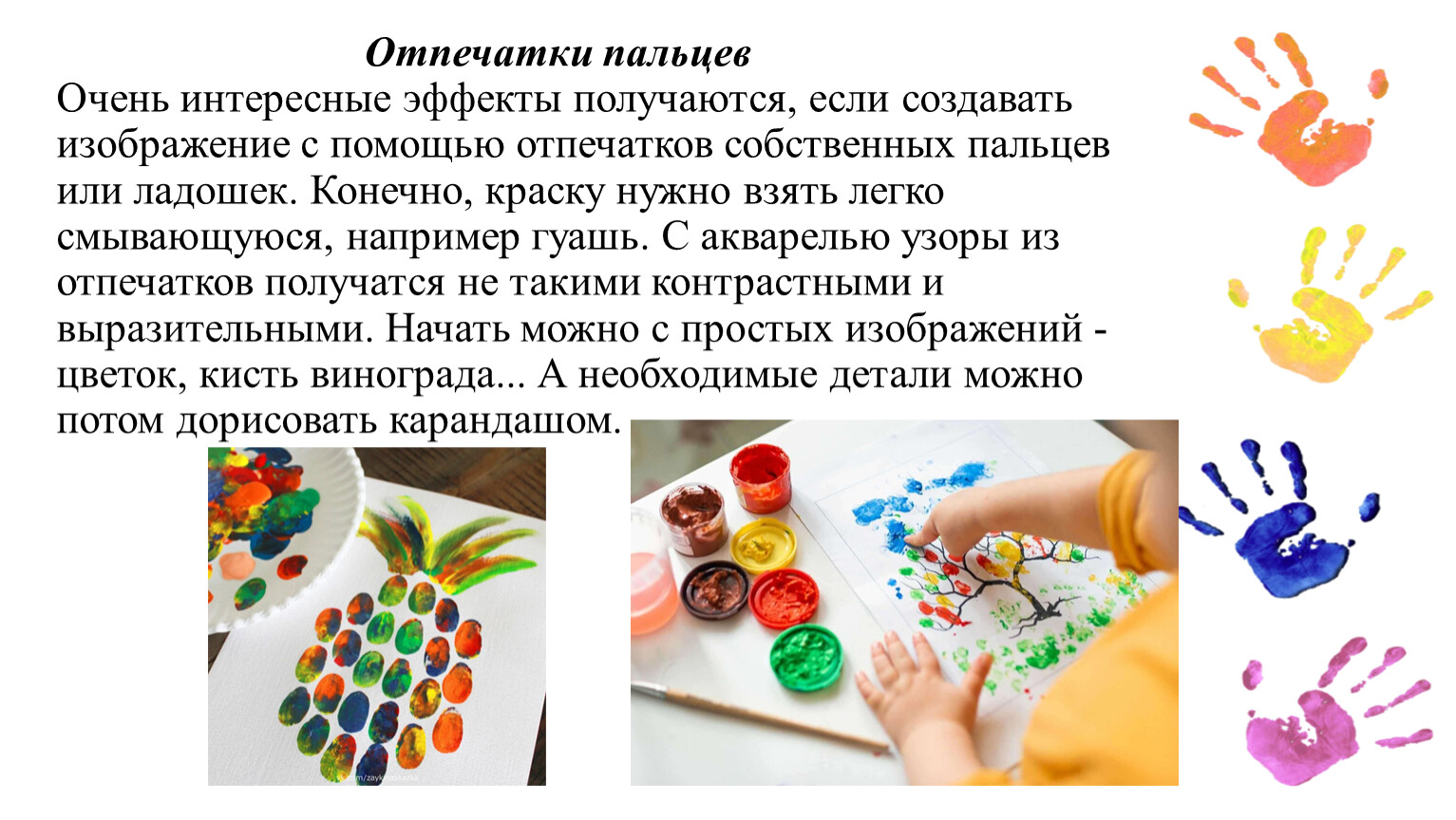 Отпечатки пальцевОчень интересные эффекты получаются, если создавать изображение с помощью отпечатков собственных пальцев или ладошек. Конечно, краску нужно взять легко смывающуюся, например гуашь. С акварелью узоры из отпечатков получатся не такими контрастными и выразительными. Начать можно с простых изображений - цветок, кисть винограда... А необходимые детали можно потом дорисовать карандашом.
