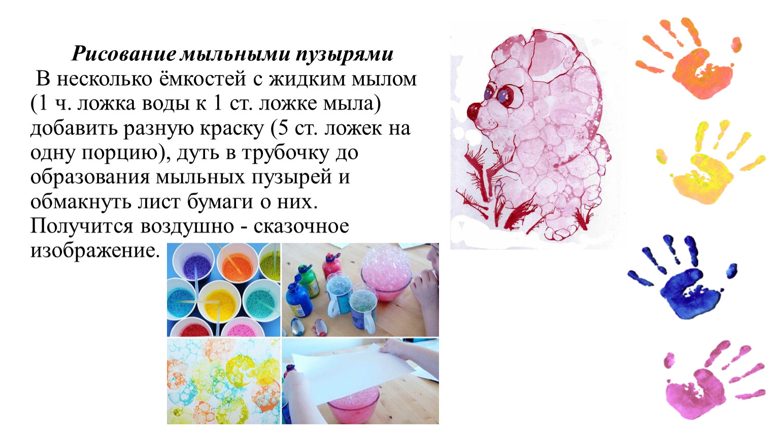 Рисование мыльными пузырями В несколько ёмкостей с жидким мылом (1 ч. ложка воды к 1 ст. ложке мыла) добавить разную краску (5 ст. ложек на одну порцию), дуть в трубочку до образования мыльных пузырей и обмакнуть лист бумаги о них. Получится воздушно - сказочное изображение.