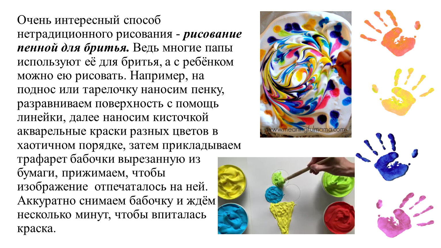 Очень интересный способ нетрадиционного рисования - рисование пенной для бритья. Ведь многие папы используют её для бритья, а с ребёнком можно ею рисовать. Например, на поднос или тарелочку наносим пенку, разравниваем поверхность с помощь линейки, далее наносим кисточкой акварельные краски разных цветов в хаотичном порядке, затем прикладываем трафарет бабочки вырезанную из бумаги, прижимаем, чтобы изображение отпечаталось на ней. Аккуратно снимаем бабочку и ждём несколько минут, чтобы впиталась краска.