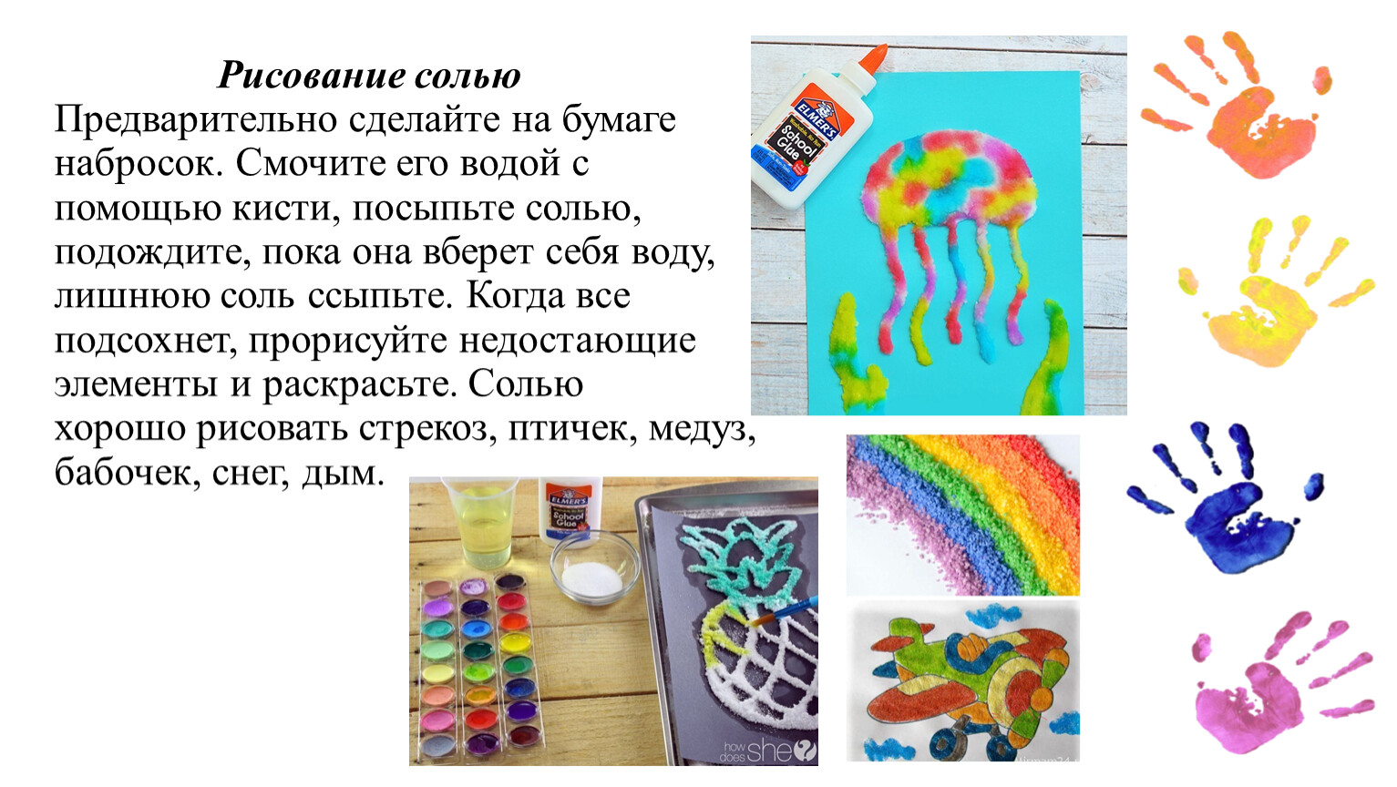 Рисование сольюПредварительно сделайте на бумаге набросок. Смочите его водой с помощью кисти, посыпьте солью, подождите, пока она вберет себя воду, лишнюю соль ссыпьте. Когда все подсохнет, прорисуйте недостающие элементы и раскрасьте. Солью хорошо рисовать стрекоз, птичек, медуз, бабочек, снег, дым.