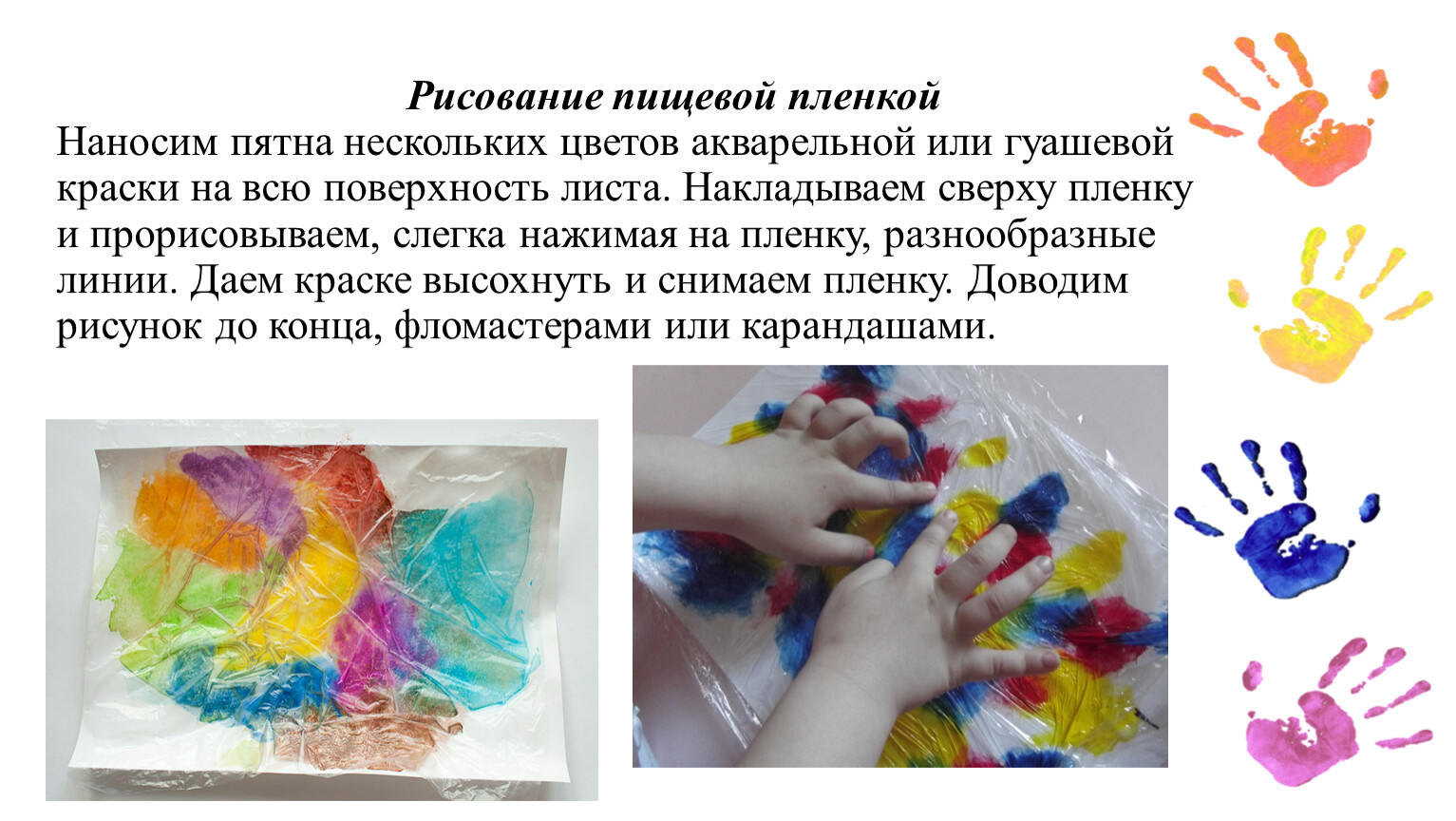 Рисование пищевой пленкойНаносим пятна нескольких цветов акварельной или гуашевой краски на всю поверхность листа. Накладываем сверху пленку и прорисовываем, слегка нажимая на пленку, разнообразные линии. Даем краске высохнуть и снимаем пленку. Доводим рисунок до конца, фломастерами или карандашами.
