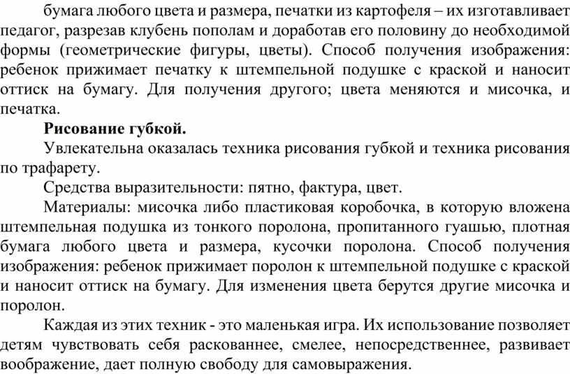 Каждая из этих техник - это маленькая игра. Их использование позволяет детям чувствовать себя раскованнее, смелее, непосредственнее, развивает воображение, дает полную свободу для самовыражения.