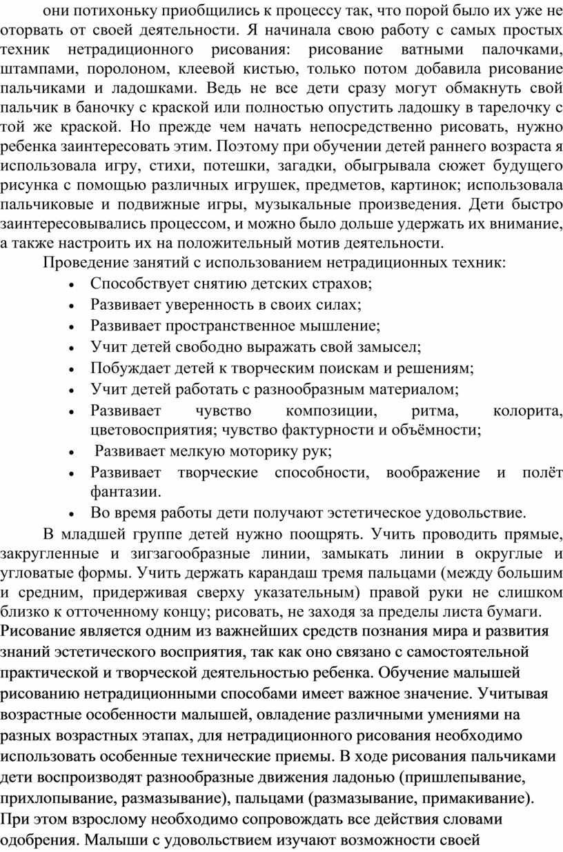 Рисование является одним из важнейших средств познания мира и развития знаний эстетического восприятия, так как оно связано с самостоятельной практической и творческой деятельностью ребенка. Обучение малышей рисованию нетрадиционными способами имеет важное значение. Учитывая возрастные особенности малышей, овладение различными умениями на разных возрастных этапах, для нетрадиционного рисования необходимо использовать особенные технические приемы. В ходе рисования пальчиками дети воспроизводят разнообразные движения ладонью (пришлепывание, прихлопывание, размазывание), пальцами (размазывание, примакивание). При этом взрослому необходимо сопровождать все действия словами одобрения. Малыши с удовольствием изучают возможности своей собственной руки, ведь с помощью одной — единственной ладошки можно получить огромное количество самых разных отпечатков, заполнить их своими собственными штрихами, превратить в настоящие шедевры. В ходе работы с детьми используются различные приемы нетрадиционного рисования: пальчиками, ладошками, печатками (штампы от картофеля), печать по трафарету, оттиск смятой бумагой.