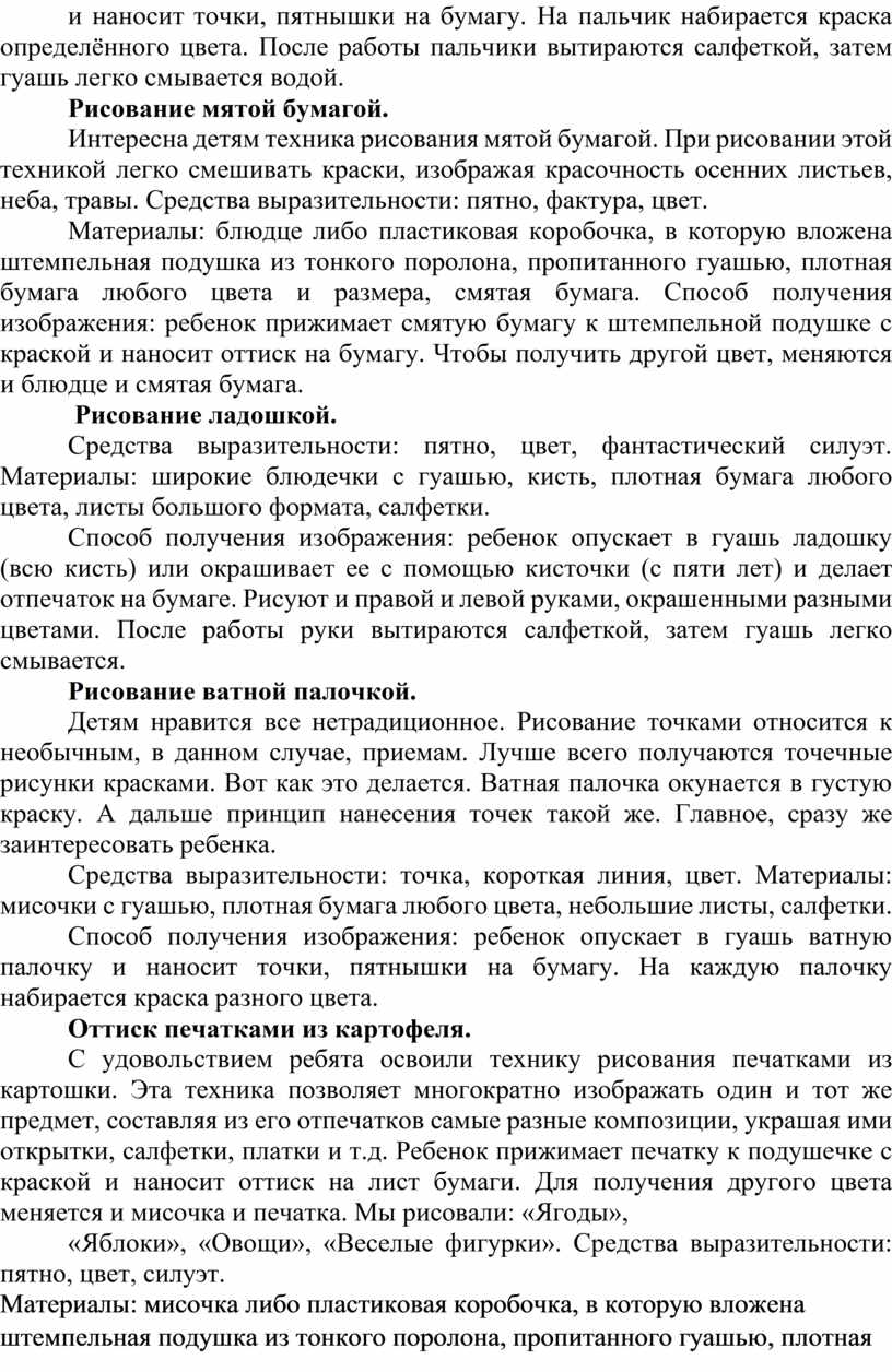 «Оттиск смятой бумагой»: ребенок прижимает смятую бумагу к штемпельной подушке с краской и наносит оттиск на бумагу. Чтобы получить другой цвет, меняются и блюдце, и смятая бумага. Нетрадиционное рисование позволяет раскрыть творческий потенциал ребенка; постепенно повышать интерес к художественной деятельности, развивать психические процессы. Оно позволяет детям чувствовать себя раскованнее, смелее, непосредственнее, развивает воображение, дает полную свободу для самовыражения.