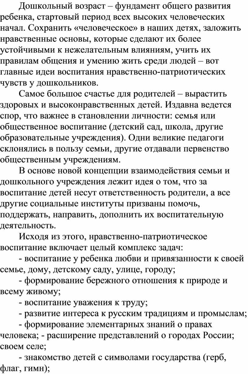 Дошкольный возраст – фундамент общего развития ребенка, стартовый период всех высоких человеческих начал. Сохранить «человеческое» в наших детях, заложить нравственные основы, которые сделают их более устойчивыми к нежелательным влияниям, учить их правилам общения и умению жить среди людей – вот главные идеи воспитания нравственно-патриотических чувств у дошкольников.