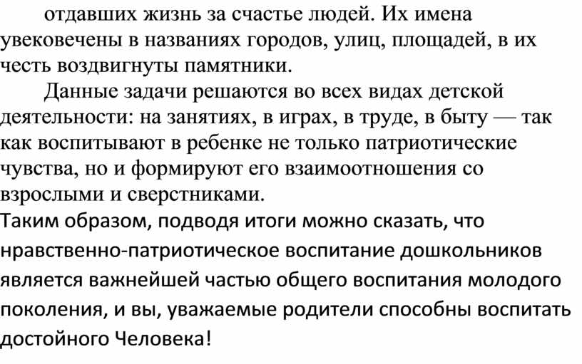 Таким образом, подводя итоги можно сказать, что нравственно-патриотическое воспитание дошкольников является важнейшей частью общего воспитания молодого поколения, и вы, уважаемые родители способны воспитать достойного Человека!