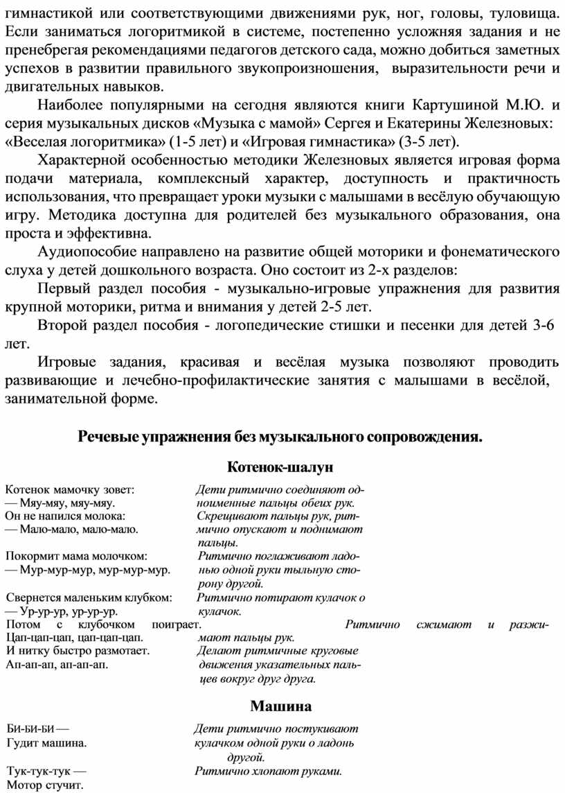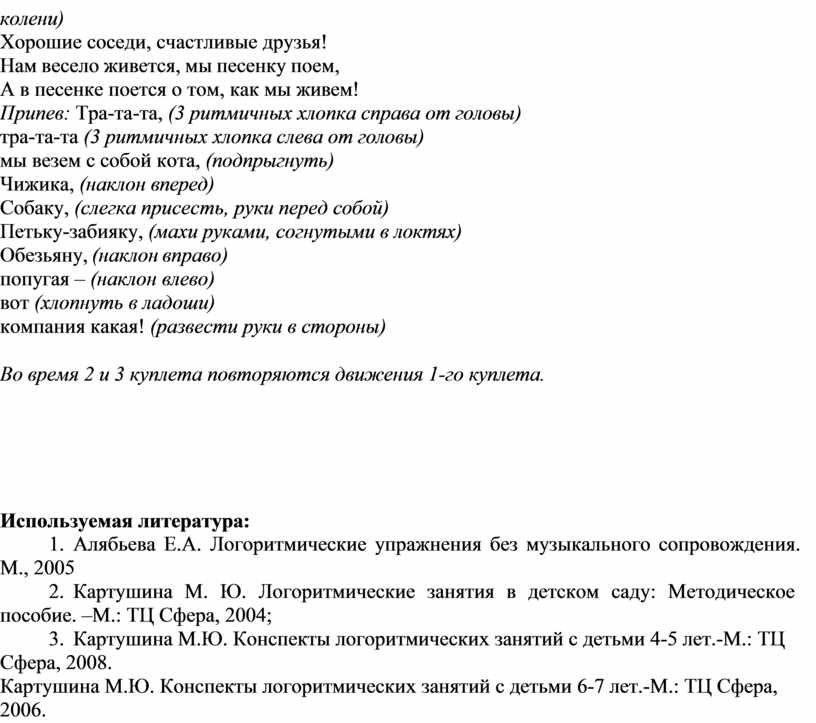 1. Алябьева Е.А. Логоритмические упражнения без музыкального сопровождения. М., 2005