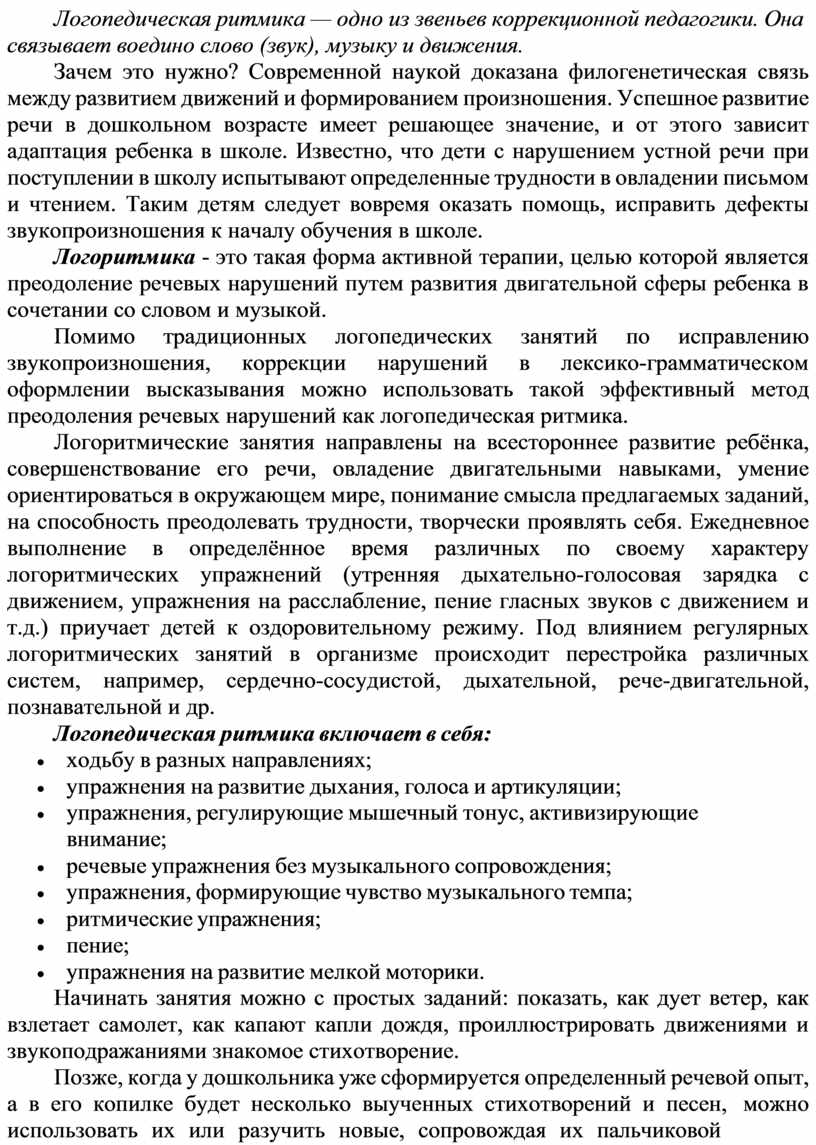 Помимо традиционных логопедических занятий по исправлению звукопроизношения, коррекции нарушений в лексико-грамматическом оформлении высказывания можно использовать такой эффективный метод преодоления речевых нарушений как логопедическая ритмика.