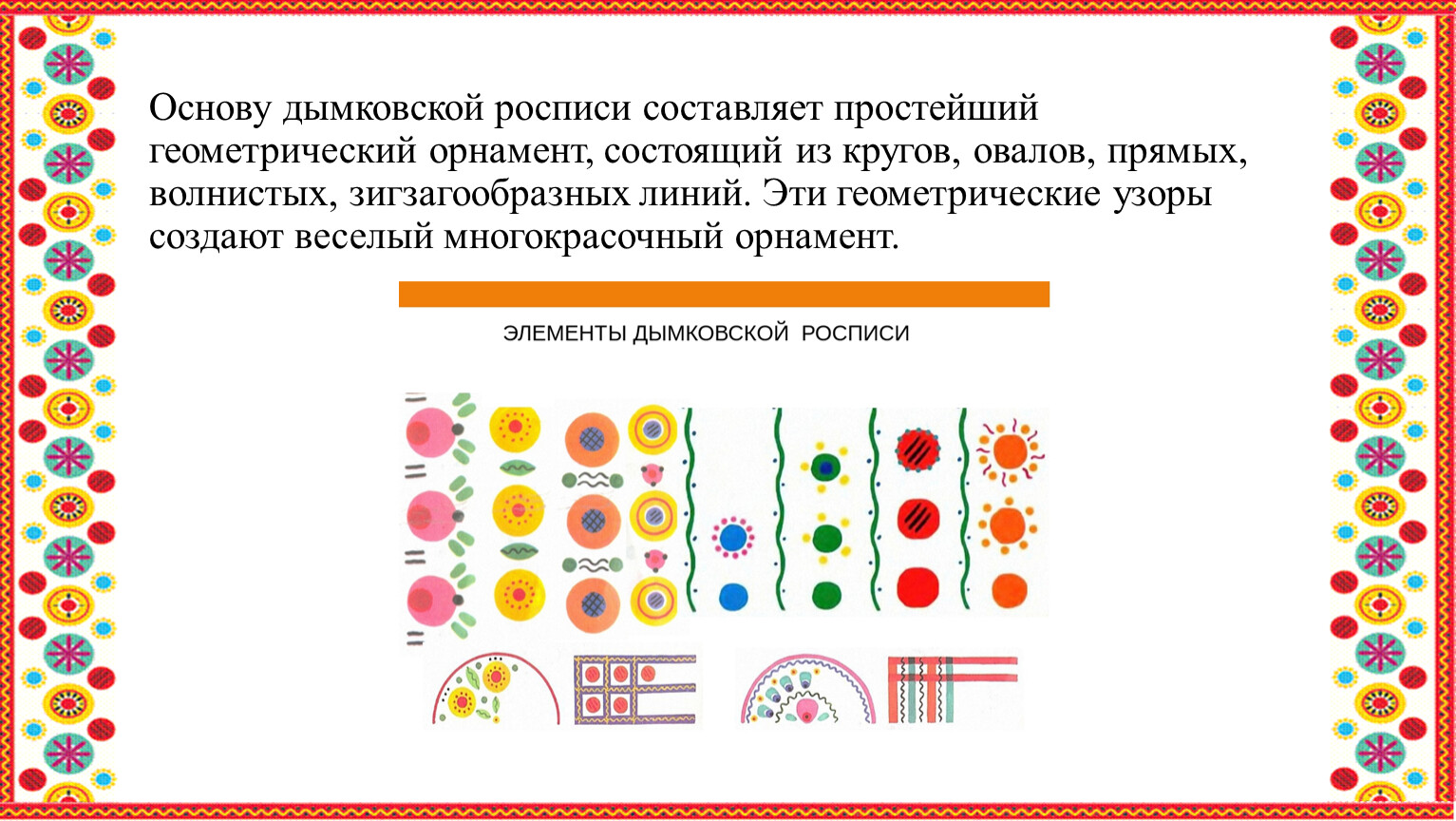 Основу дымковской росписи составляет простейший геометрический орнамент, состоящий из кругов, овалов, прямых, волнистых, зигзагообразных линий. Эти геометрические узоры создают веселый многокрасочный орнамент.