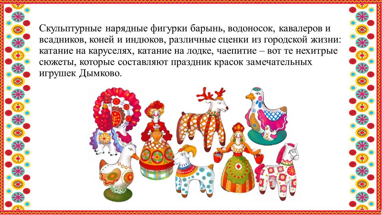 Скульптурные нарядные фигурки барынь, водоносок, кавалеров и всадников, коней и индюков, различные сценки из городской жизни: катание на каруселях, катание на лодке, чаепитие – вот те нехитрые сюжеты, которые составляют праздник красок замечательных игрушек Дымково.