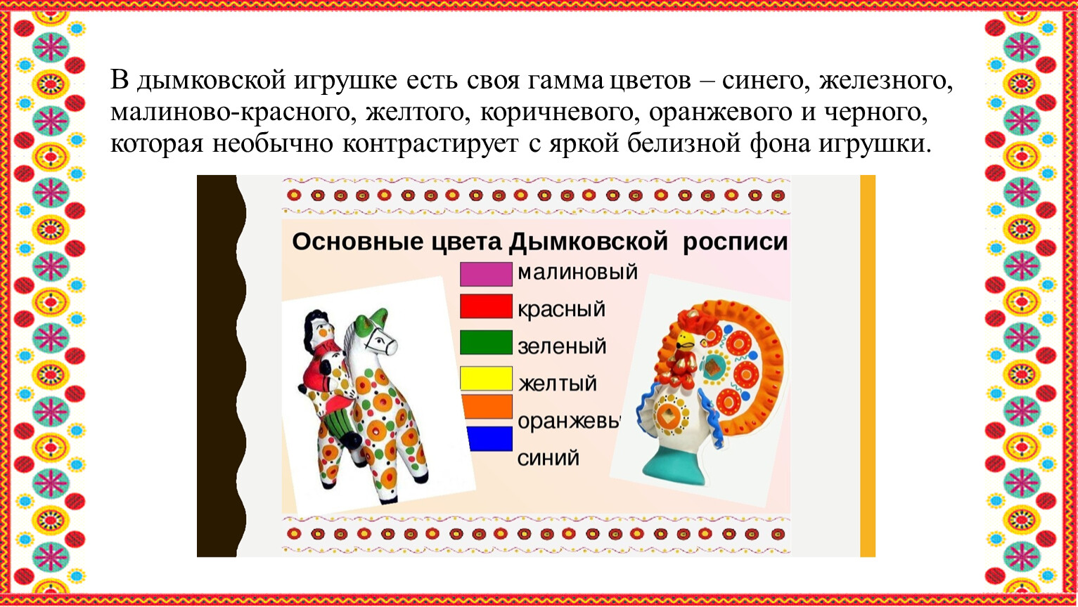 В дымковской игрушке есть своя гамма цветов – синего, железного, малиново-красного, желтого, коричневого, оранжевого и черного, которая необычно контрастирует с яркой белизной фона игрушки.