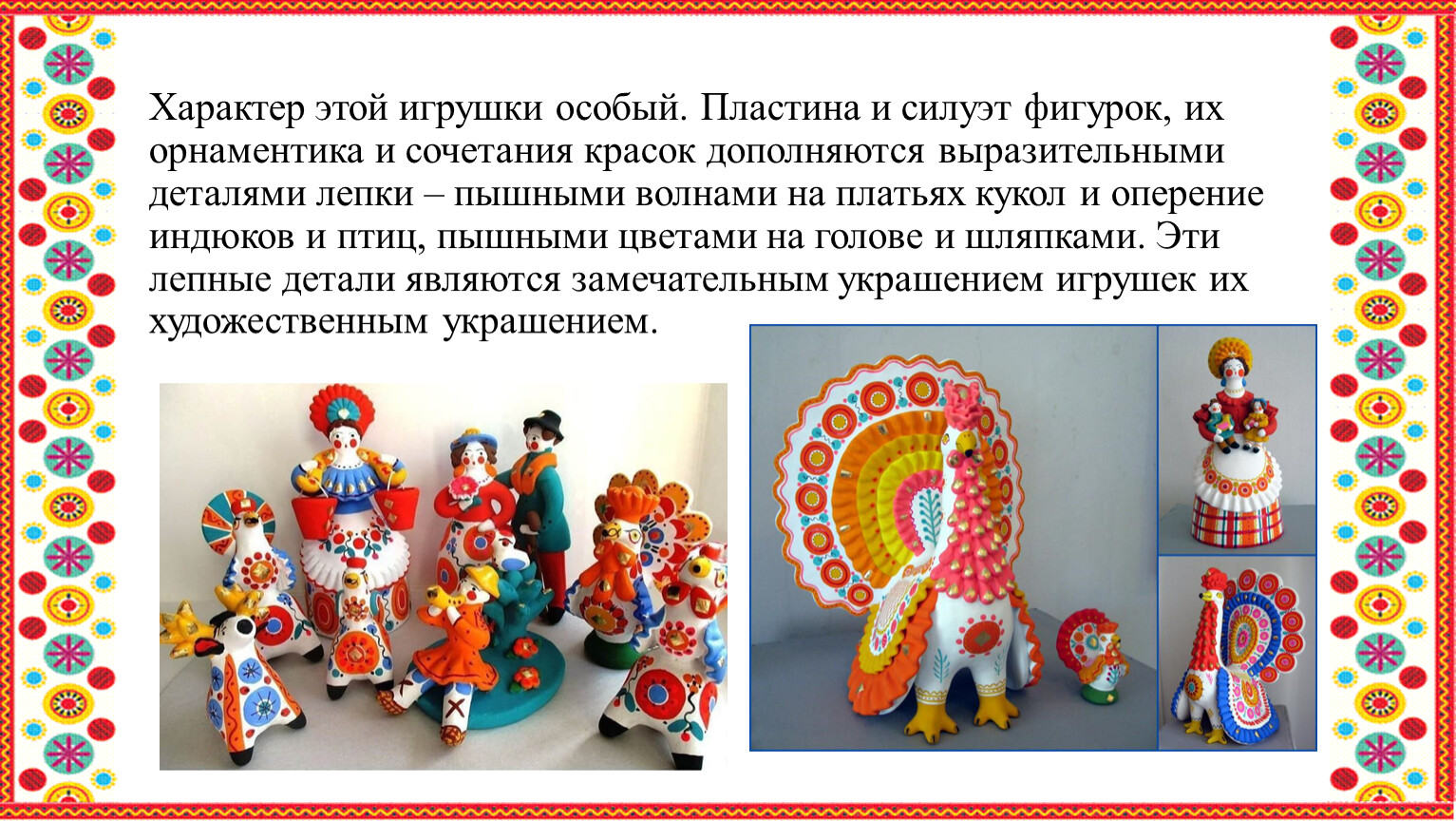 Характер этой игрушки особый. Пластина и силуэт фигурок, их орнаментика и сочетания красок дополняются выразительными деталями лепки – пышными волнами на платьях кукол и оперение индюков и птиц, пышными цветами на голове и шляпками. Эти лепные детали являются замечательным украшением игрушек их художественным украшением.