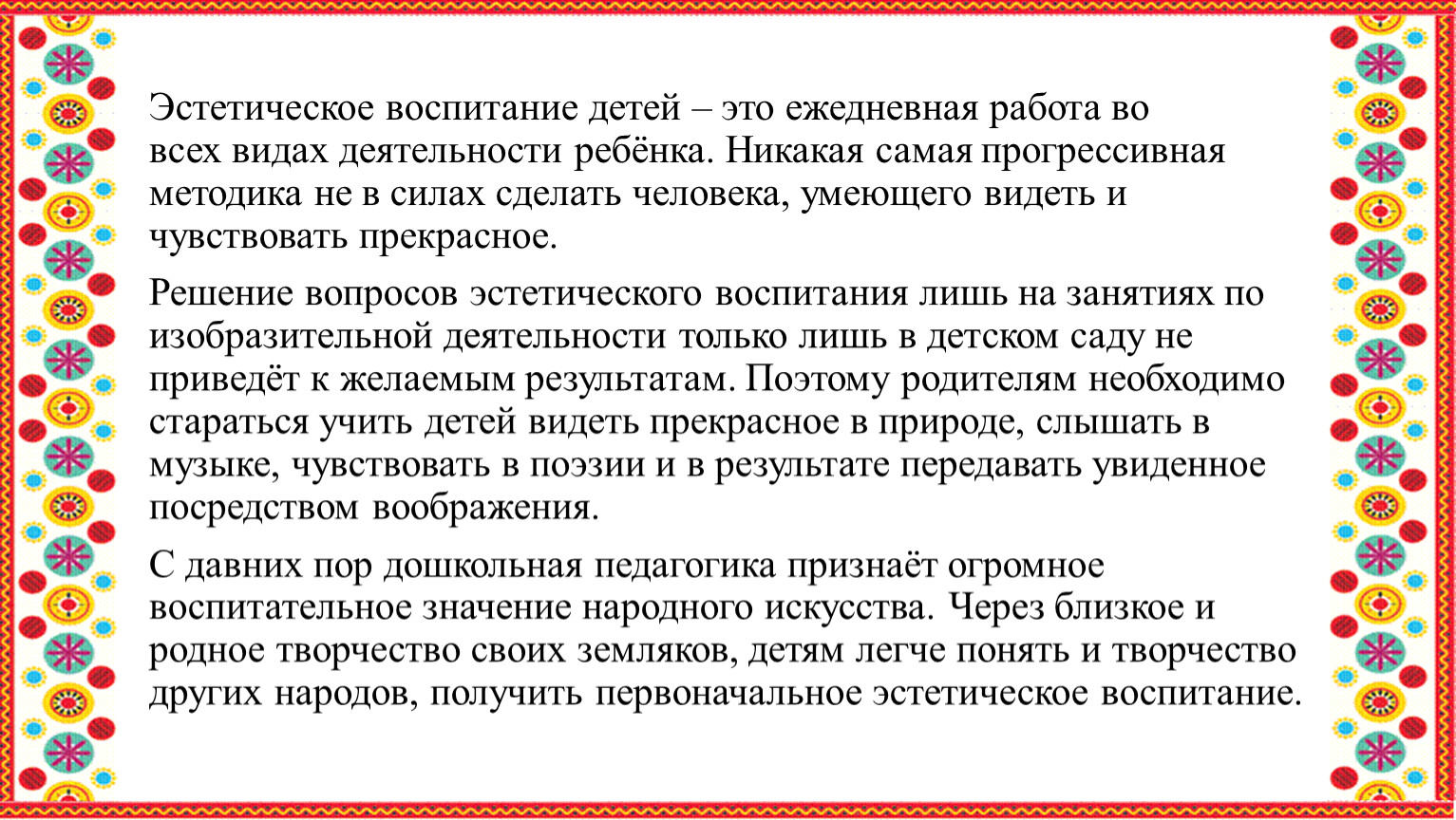 С давних пор дошкольная педагогика признаёт огромное воспитательное значение народного искусства. Через близкое и родное творчество своих земляков, детям легче понять и творчество других народов, получить первоначальное эстетическое воспитание.