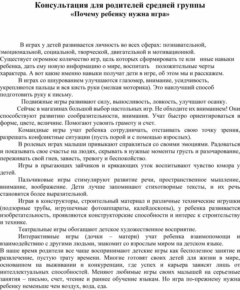 В наше время родители все чаще воспринимают детские игры как бесполезное занятие и развлечение, пустую трату времени. Многие готовят своих детей для жизни в мире, основанном на выживании и конкуренции, где успех и карьера зависят лишь от интеллектуальных способностей. Меняют любимые игры своих малышей на серьезные занятия – письмо, счет, чтение и раннее обучение языкам. Но игра по-прежнему нужна ребенку неменьше чем воздух, вода, еда.