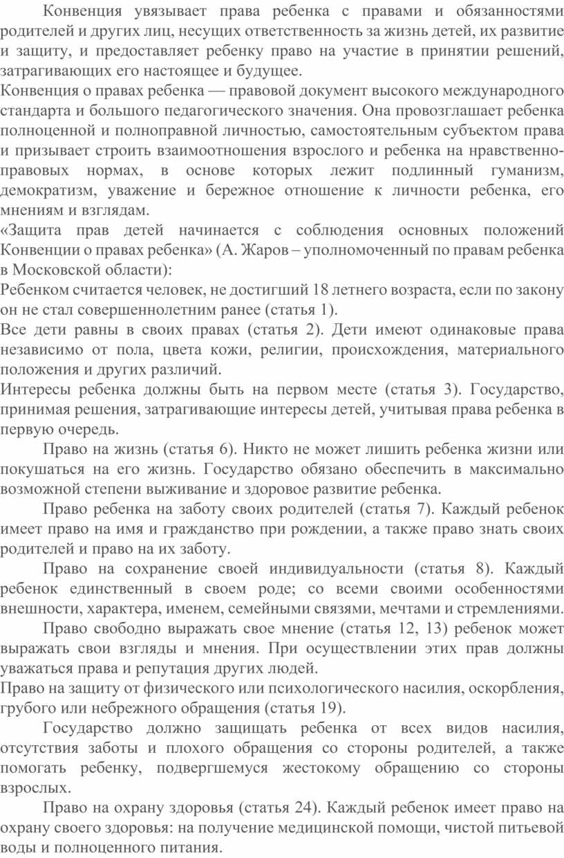 Конвенция о правах ребенка — правовой документ высокого международного стандарта и большого педагогического значения. Она провозглашает ребенка полноценной и полноправной личностью, самостоятельным субъектом права и призывает строить взаимоотношения взрослого и ребенка на нравственно-правовых нормах, в основе которых лежит подлинный гуманизм, демократизм, уважение и бережное отношение к личности ребенка, его мнениям и взглядам.