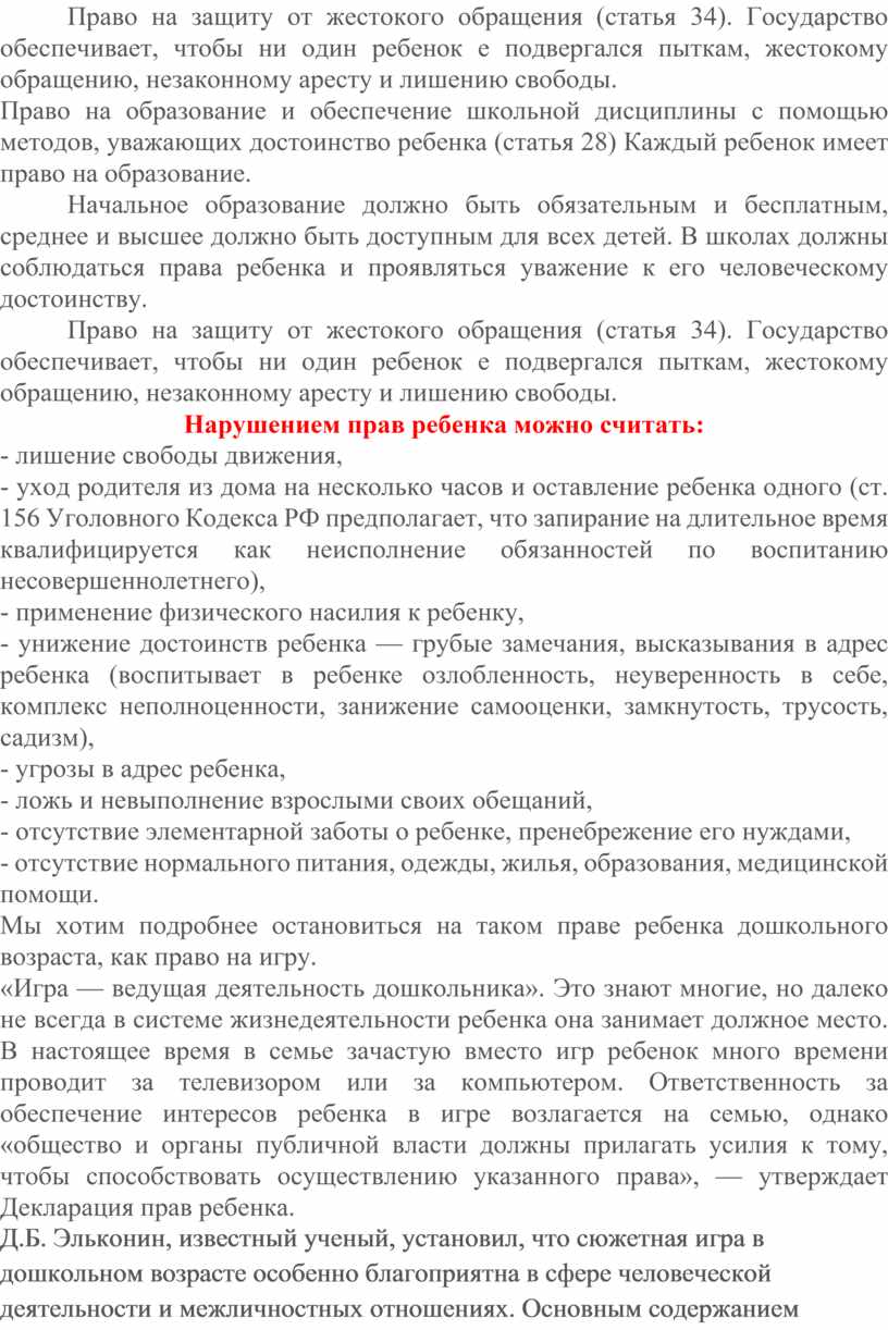 Право на защиту от жестокого обращения (статья 34). Государство обеспечивает, чтобы ни один ребенок е подвергался пыткам, жестокому обращению, незаконному аресту и лишению свободы.