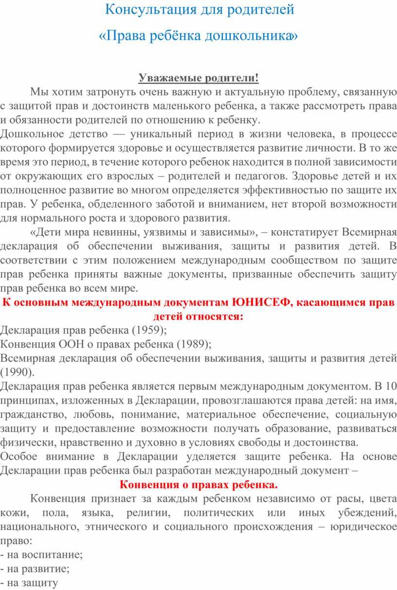 Дошкольное детство — уникальный период в жизни человека, в процессе которого формируется здоровье и осуществляется развитие личности. В то же время это период, в течение которого ребенок находится в полной зависимости от окружающих его взрослых – родителей и педагогов. Здоровье детей и их полноценное развитие во многом определяется эффективностью по защите их прав. У ребенка, обделенного заботой и вниманием, нет второй возможности для нормального роста и здорового развития.