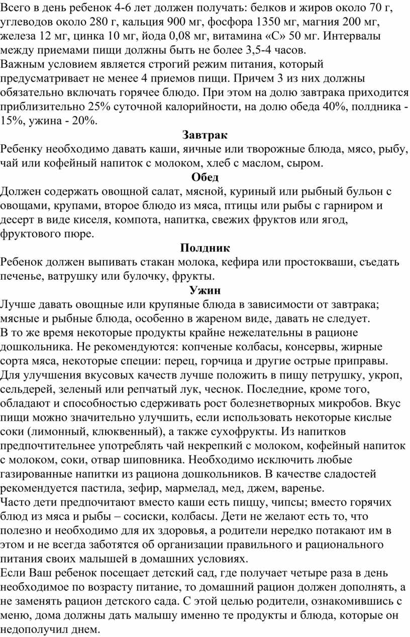 Всего в день ребенок 4-6 лет должен получать: белков и жиров около 70 г, углеводов около 280 г, кальция 900 мг, фосфора 1350 мг, магния 200 мг, железа 12 мг, цинка 10 мг, йода 0,08 мг, витамина «С» 50 мг. Интервалы между приемами пищи должны быть не более 3,5-4 часов.