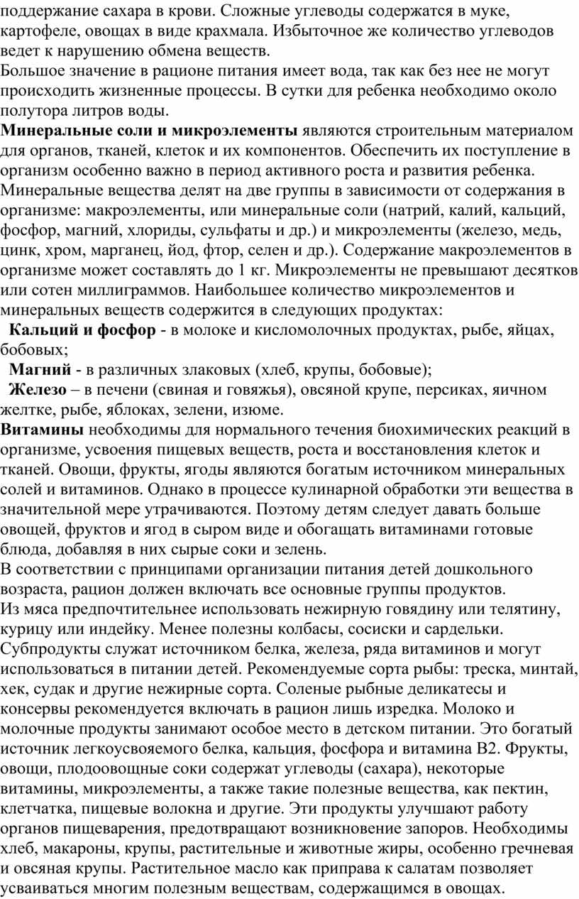 Витамины необходимы для нормального течения биохимических реакций в организме, усвоения пищевых веществ, роста и восстановления клеток и тканей. Овощи, фрукты, ягоды являются богатым источником минеральных солей и витаминов. Однако в процессе кулинарной обработки эти вещества в значительной мере утрачиваются. Поэтому детям следует давать больше овощей, фруктов и ягод в сыром виде и обогащать витаминами готовые блюда, добавляя в них сырые соки и зелень.