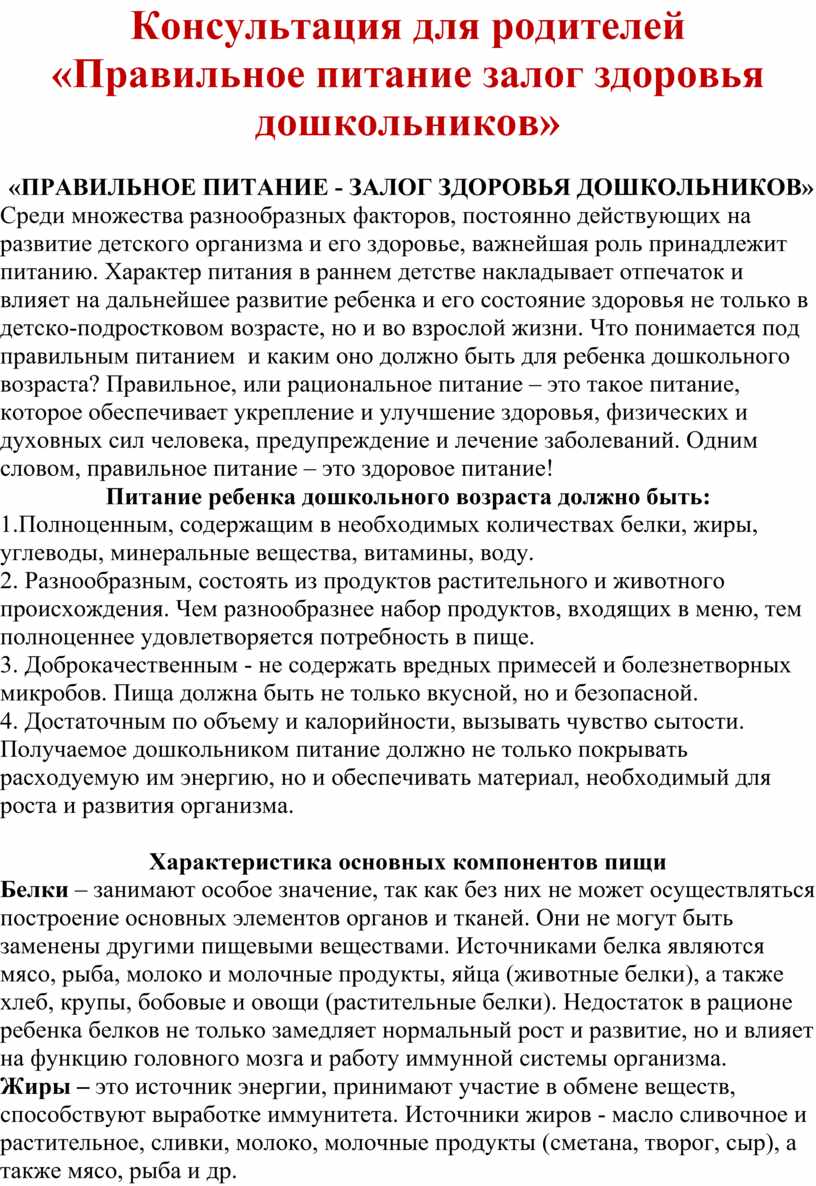 Консультация для родителей «Правильное питание залог здоровья дошкольников»