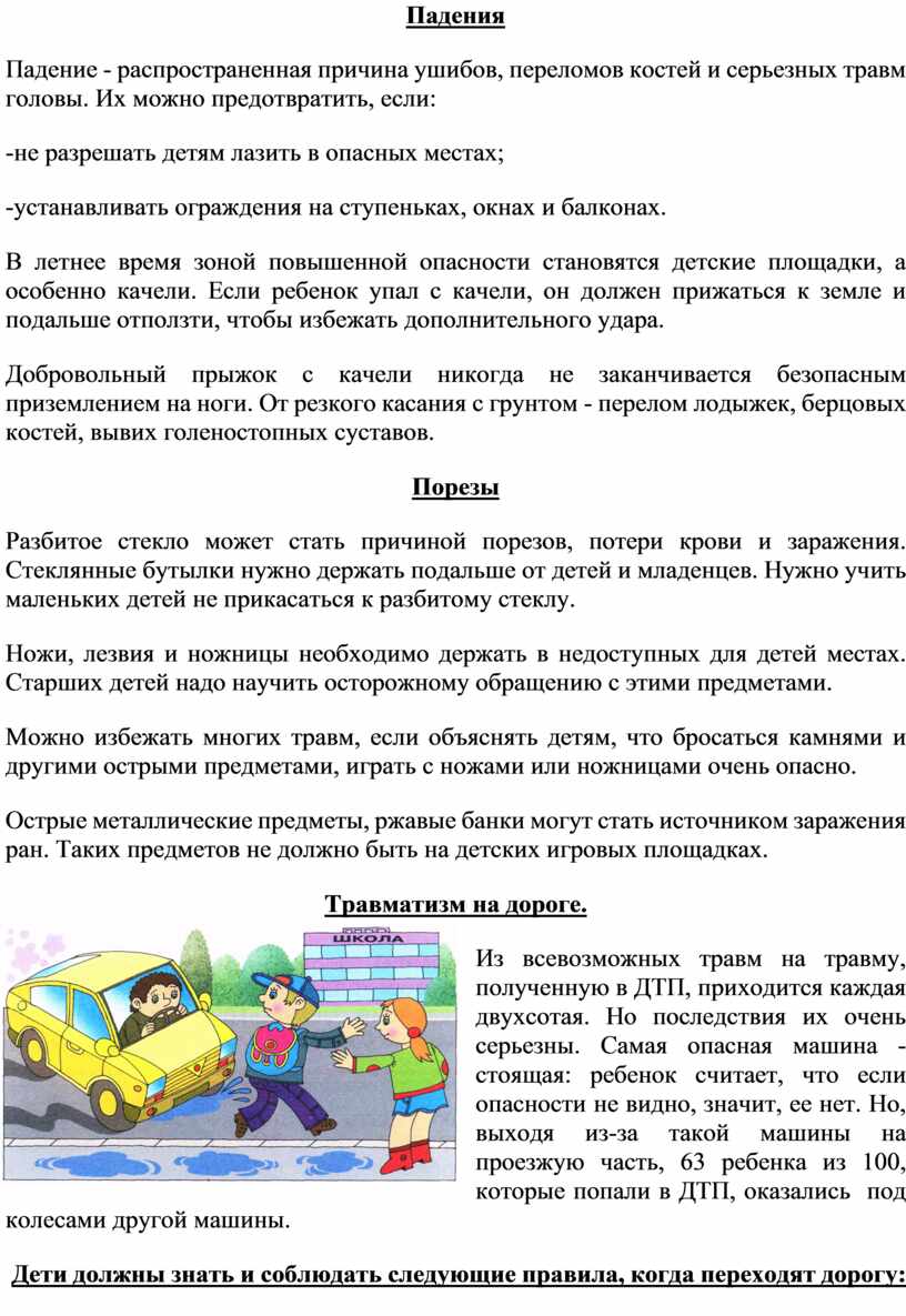В летнее время зоной повышенной опасности становятся детские площадки, а особенно качели. Если ребенок упал с качели, он должен прижаться к земле и подальше отползти, чтобы избежать дополнительного удара.