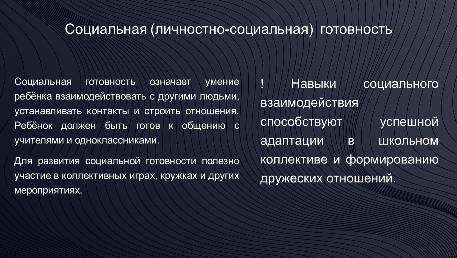 Социальная готовность означает умение ребёнка взаимодействовать с другими людьми, устанавливать контакты и строить отношения. Ребёнок должен быть готов к общению с учителями и одноклассниками.